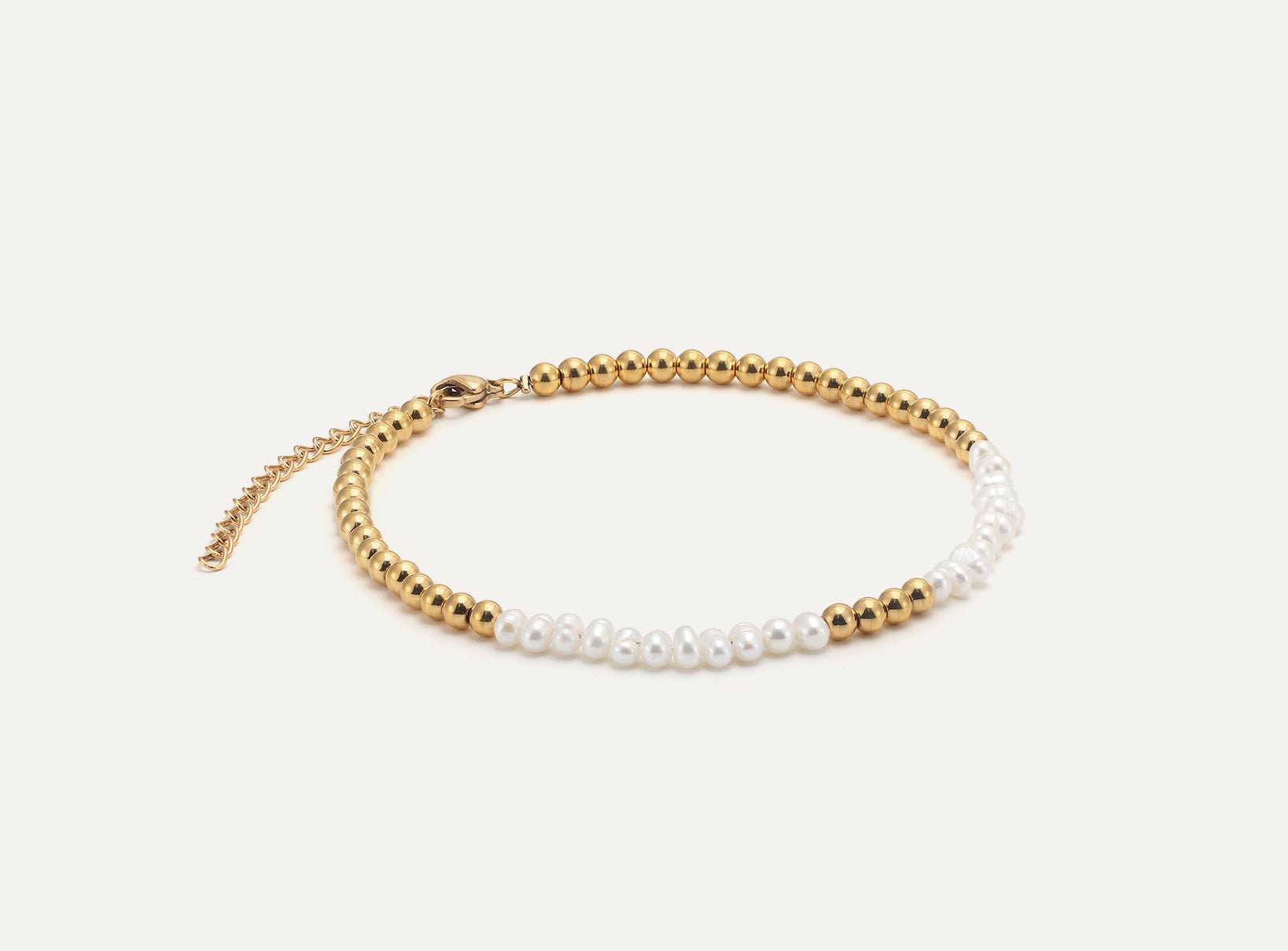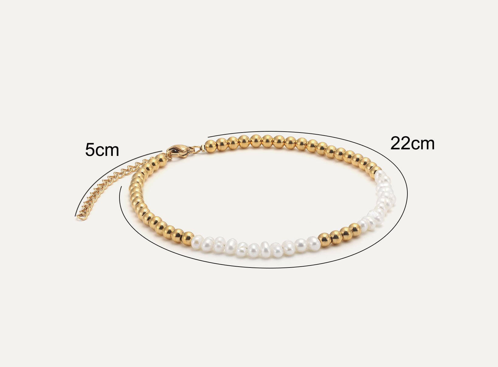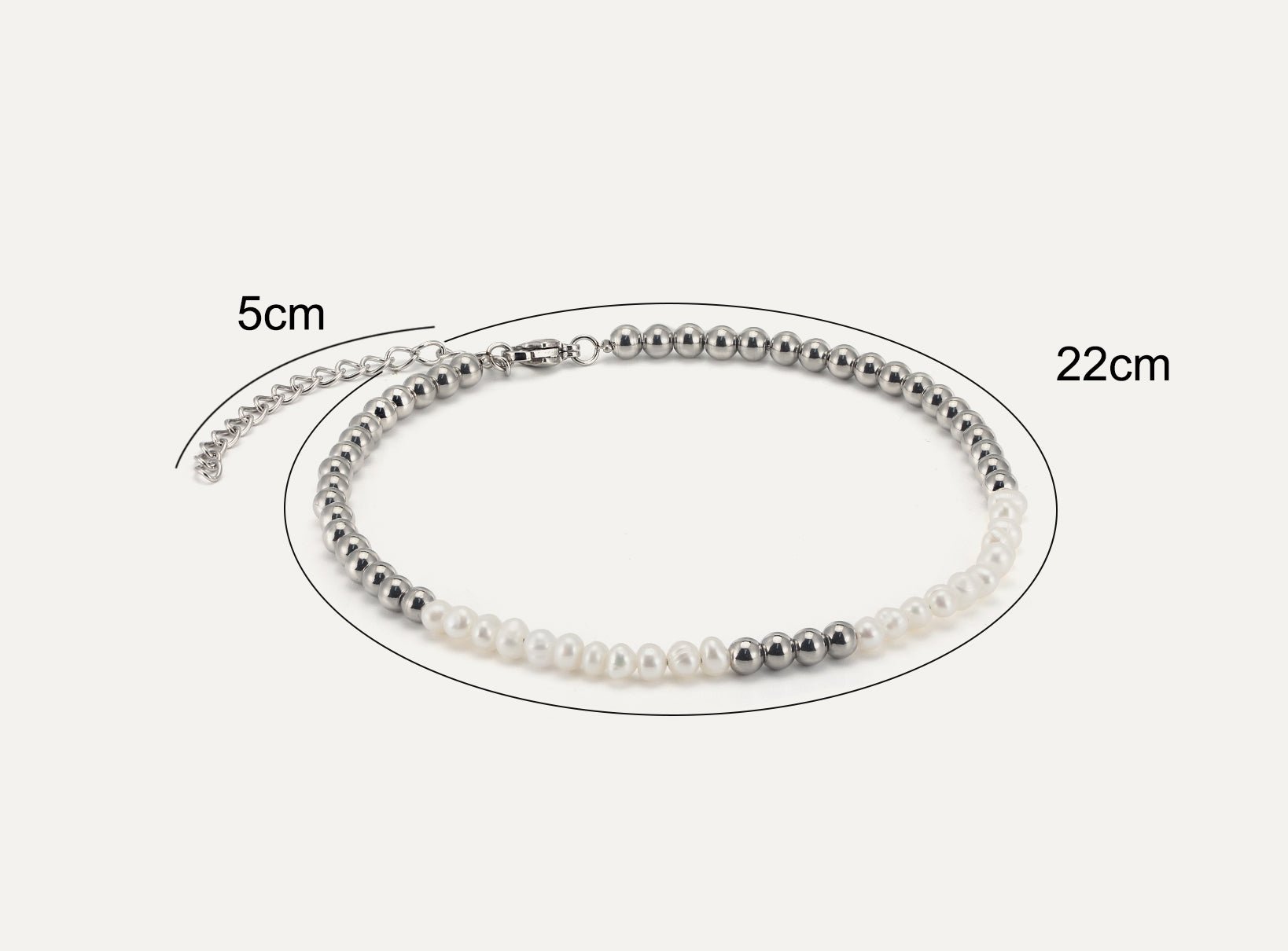 The allure of Freshwater Pearls lies in their slight unevenness, offering an organic and natural feel that sets them apart from perfectly round pearls. Paired with highly polished, glossy stainless steel beads, this anklet creates a refined fusion of modern design and a fresh take on the classic pearl aesthetic.