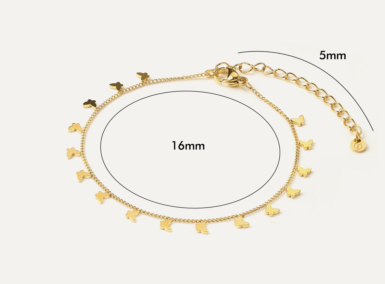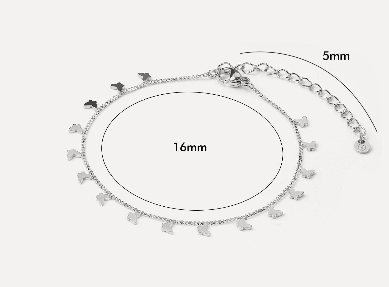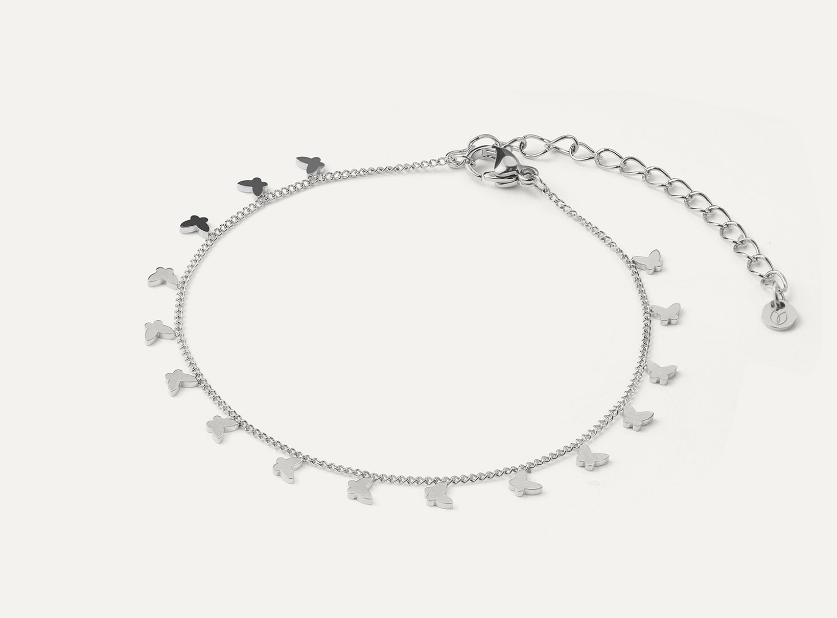 Tiny butterfly charms flutter lightly around your wrist, catching the light with every movement. The surfaces reflect with an almost iridescent sharpness, while the soft polish ensures effortless wear.