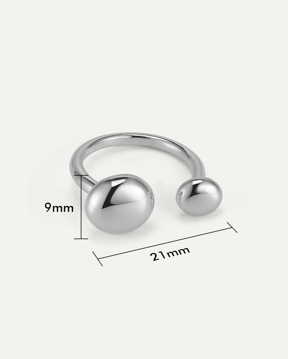 This ring adds a touch of magic to your look: two shiny, round orbs seem to float weightlessly on your hand, as if they were suspended. The invisible connection underneath enhances the effect, allowing the shimmering shapes to stand free. The ring is also incredibly comfortable, with an adjustable size that ensures a perfect fit and adapts to your finger.