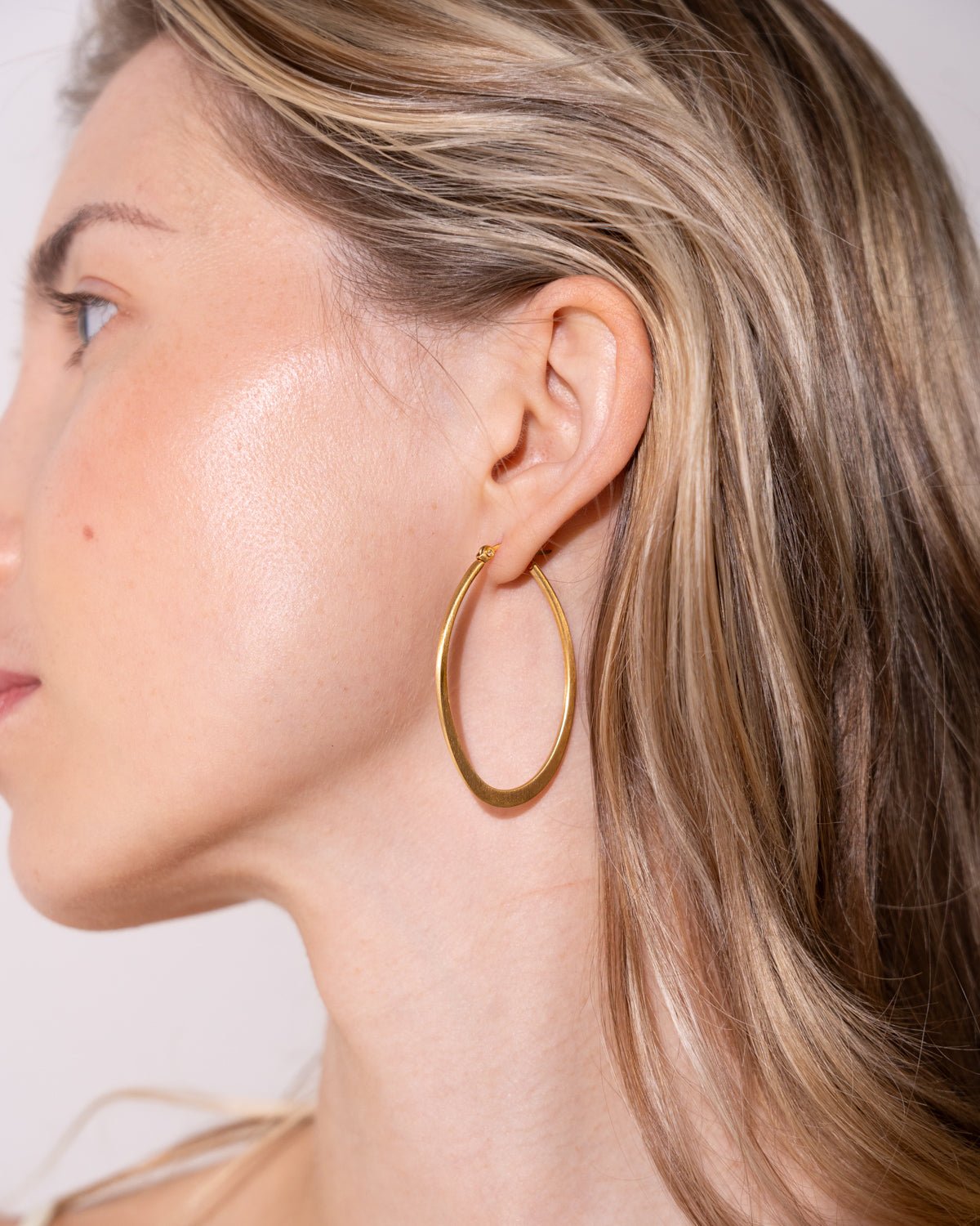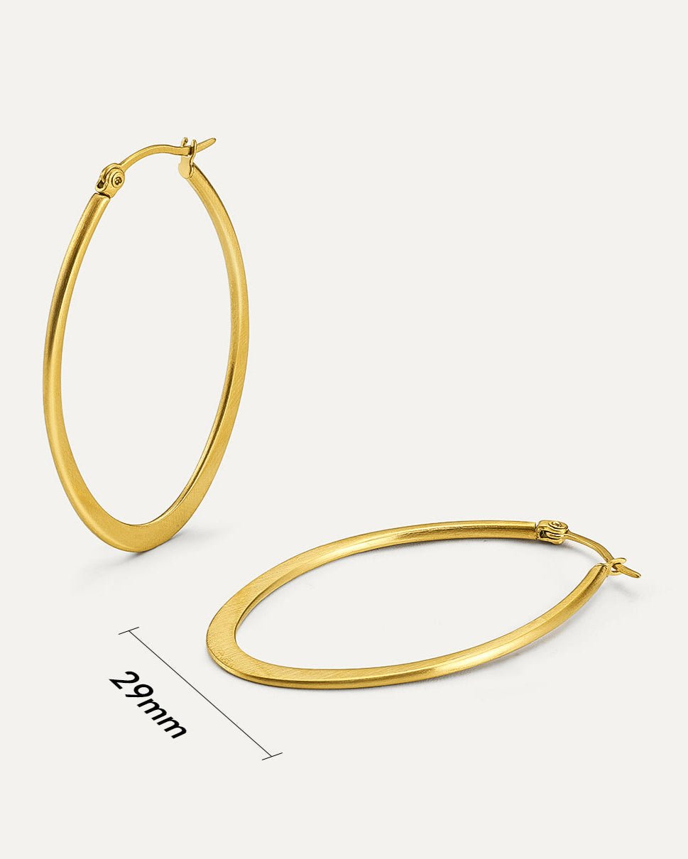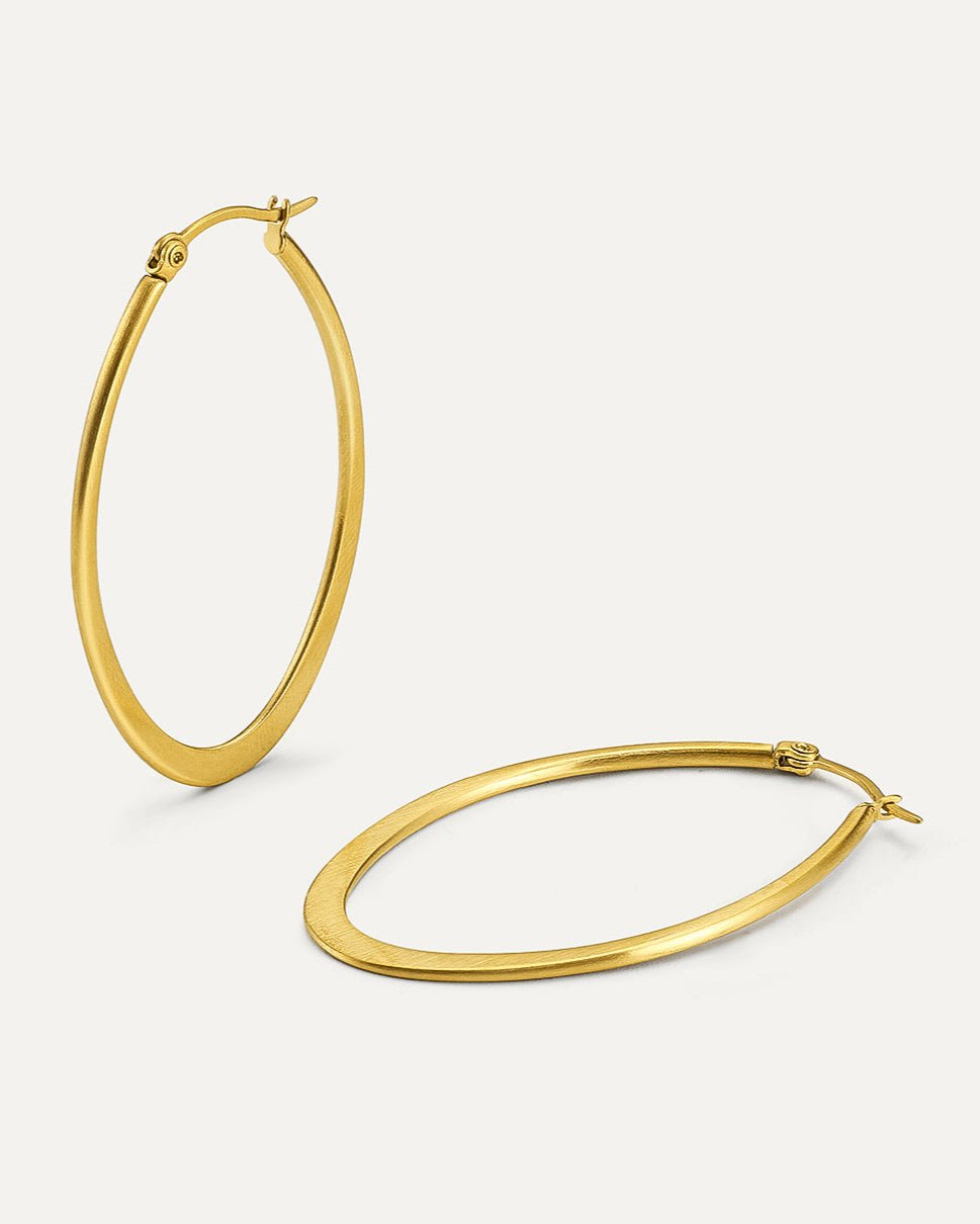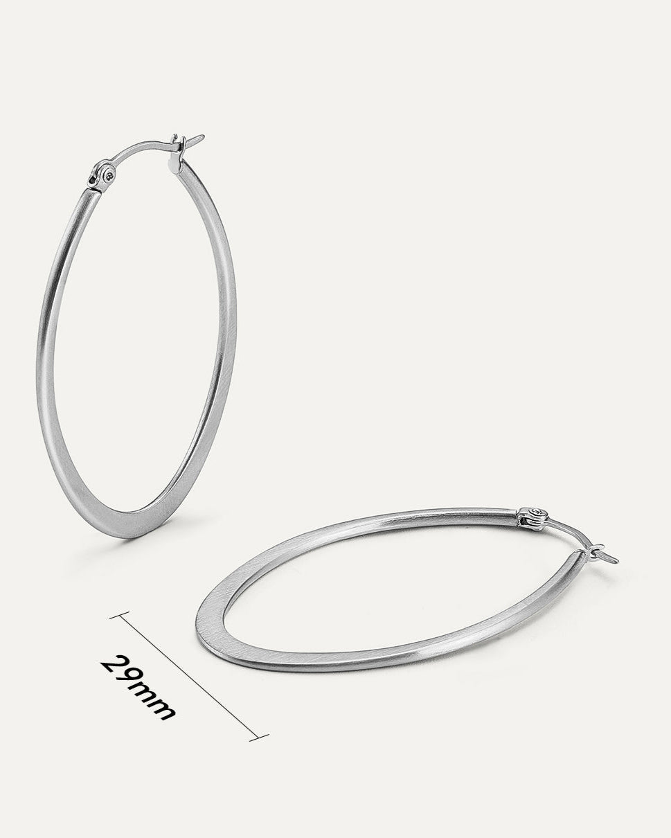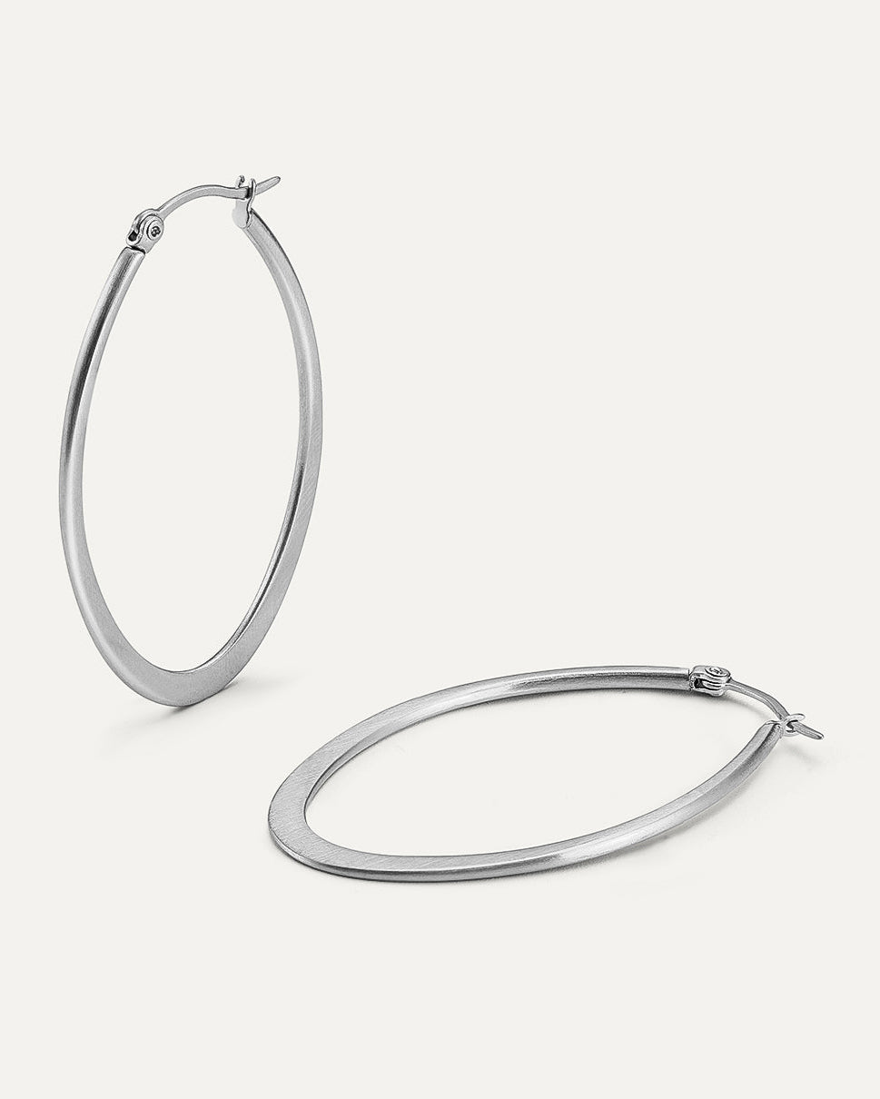An oval shape with a slightly wider part at the bottom, resembling a crescent moon. A modern take on the classic hoop earring, this design stands out with its matte finish, giving it a unique and sophisticated edge.