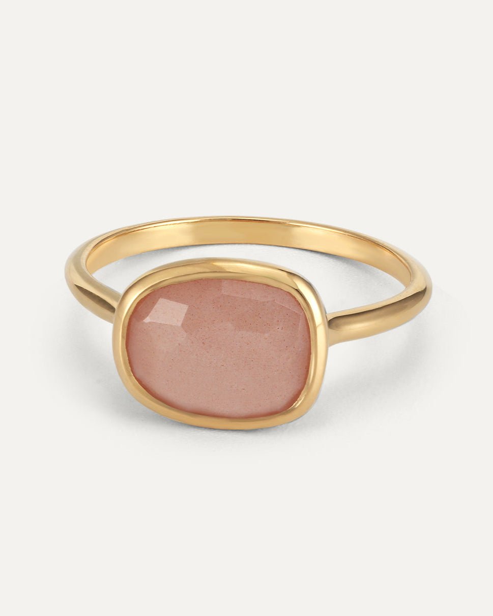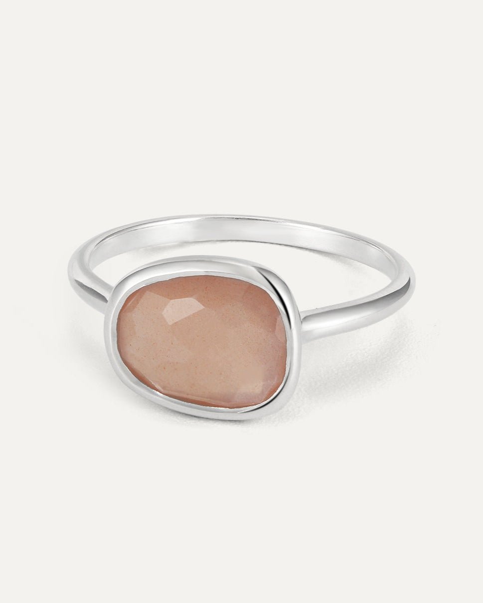 A tender glow of dawn, the peach moonstone rests like a dewdrop on a delicate ring band.