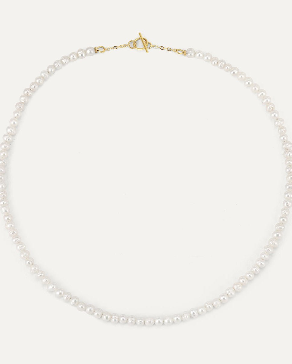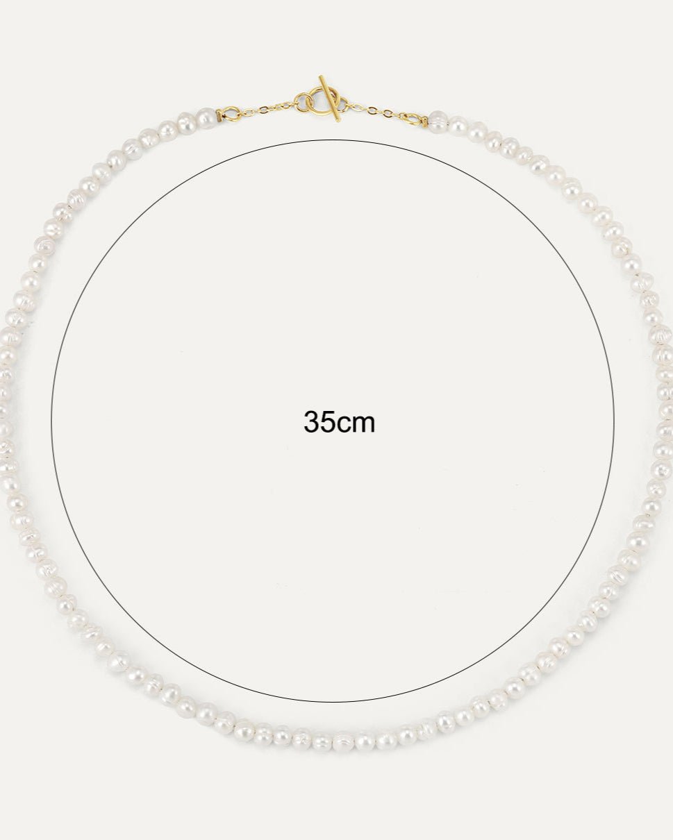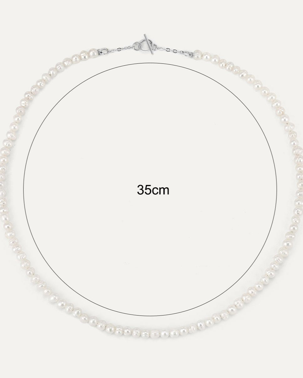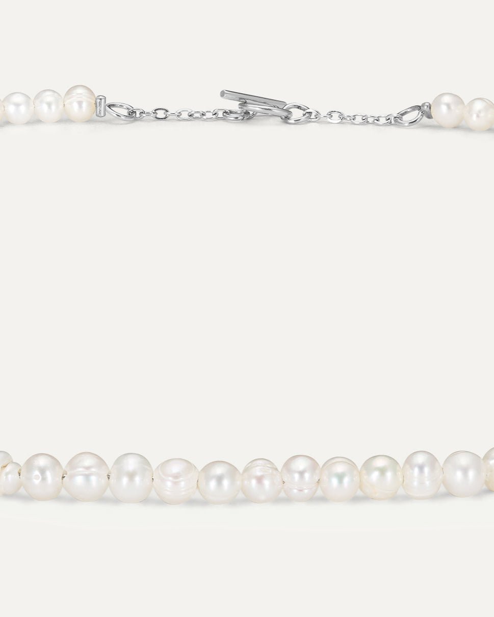 A fresh take on a classic. This short necklace sits right in the crease of your neck — elegant, but with a bit of edge. The freshwater pearls have that natural, irregular shape, which gives it a more organic, less polished feel (in the best way).