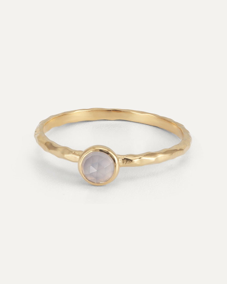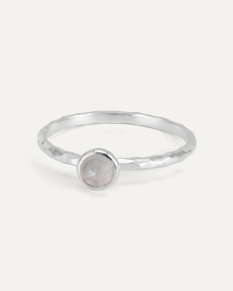 Design: A round, dome-shaped rose-cut blue chalcedony stone, with a soft milky blue hue, sits on a uniquely patterned, melted-look band. The geometric facets of the stone beautifully contrast with the organic, wavy texture of the band, creating a striking interplay of shapes.