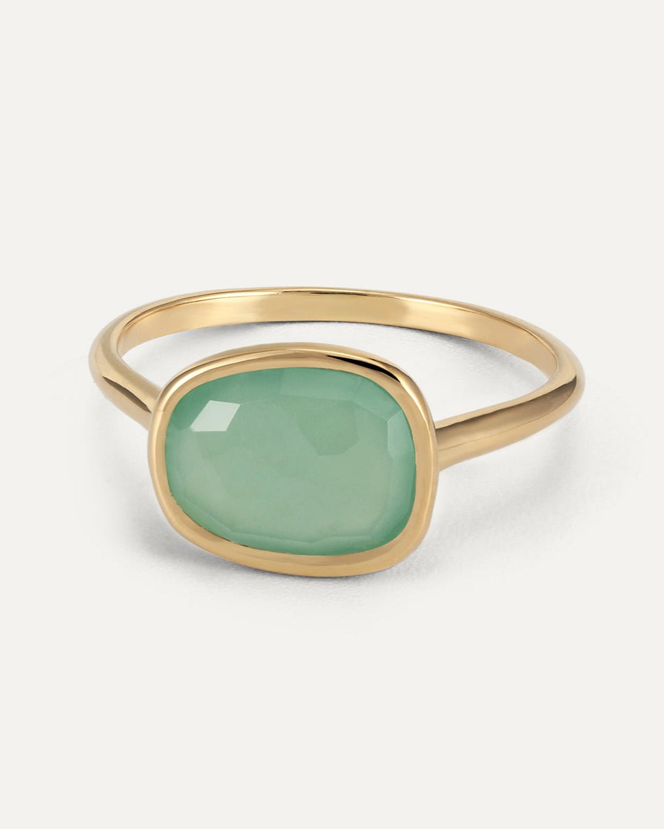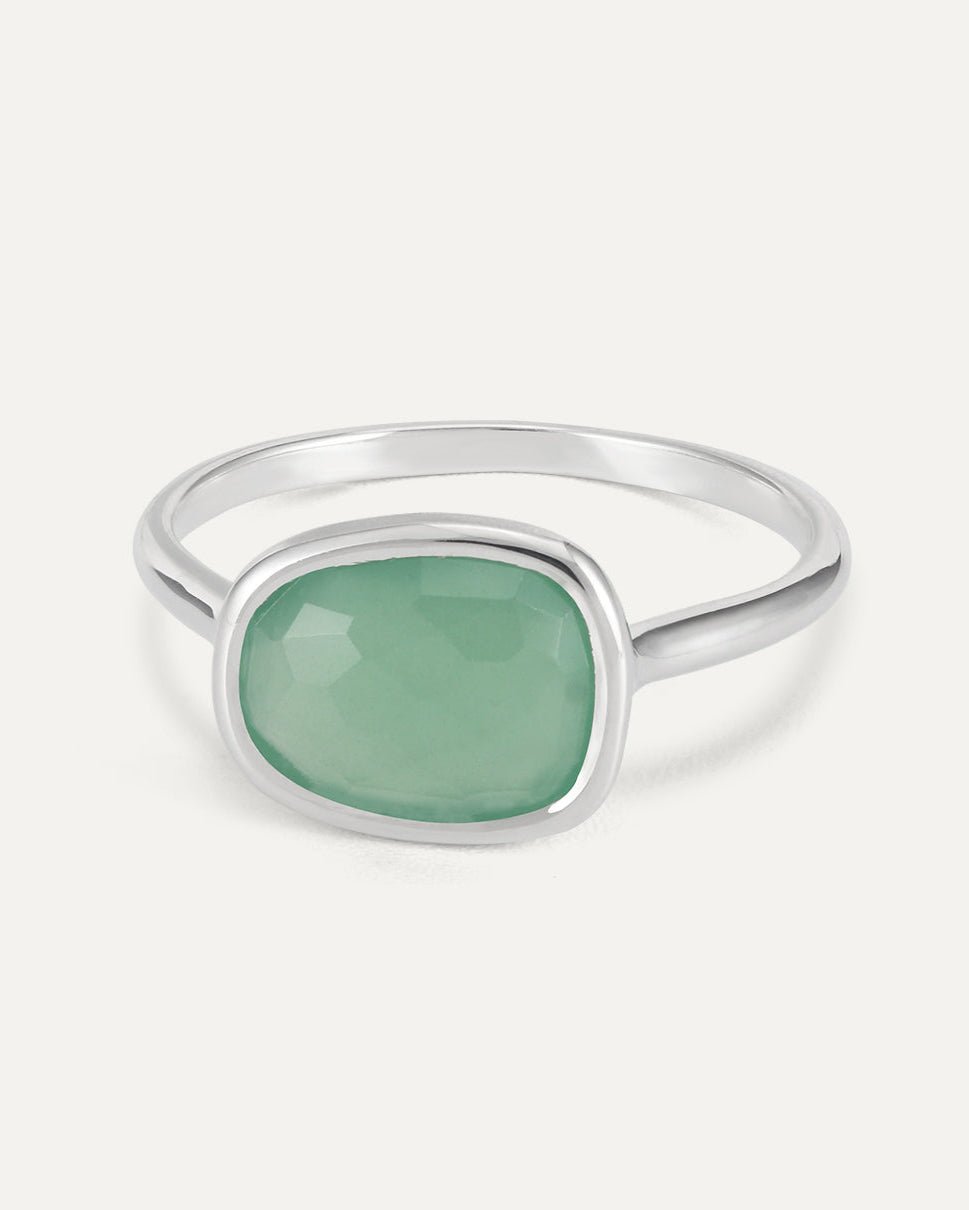 Design: Like a dew drop nestled on a blade of grass at dawn, the green aventurine stone is finely cut with angular facets that catch the light, offering a tranquil, earthy beauty atop the fine ring band.