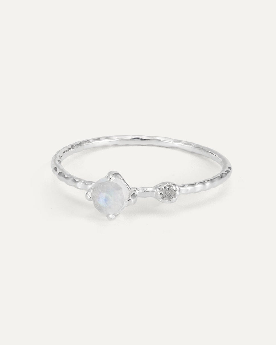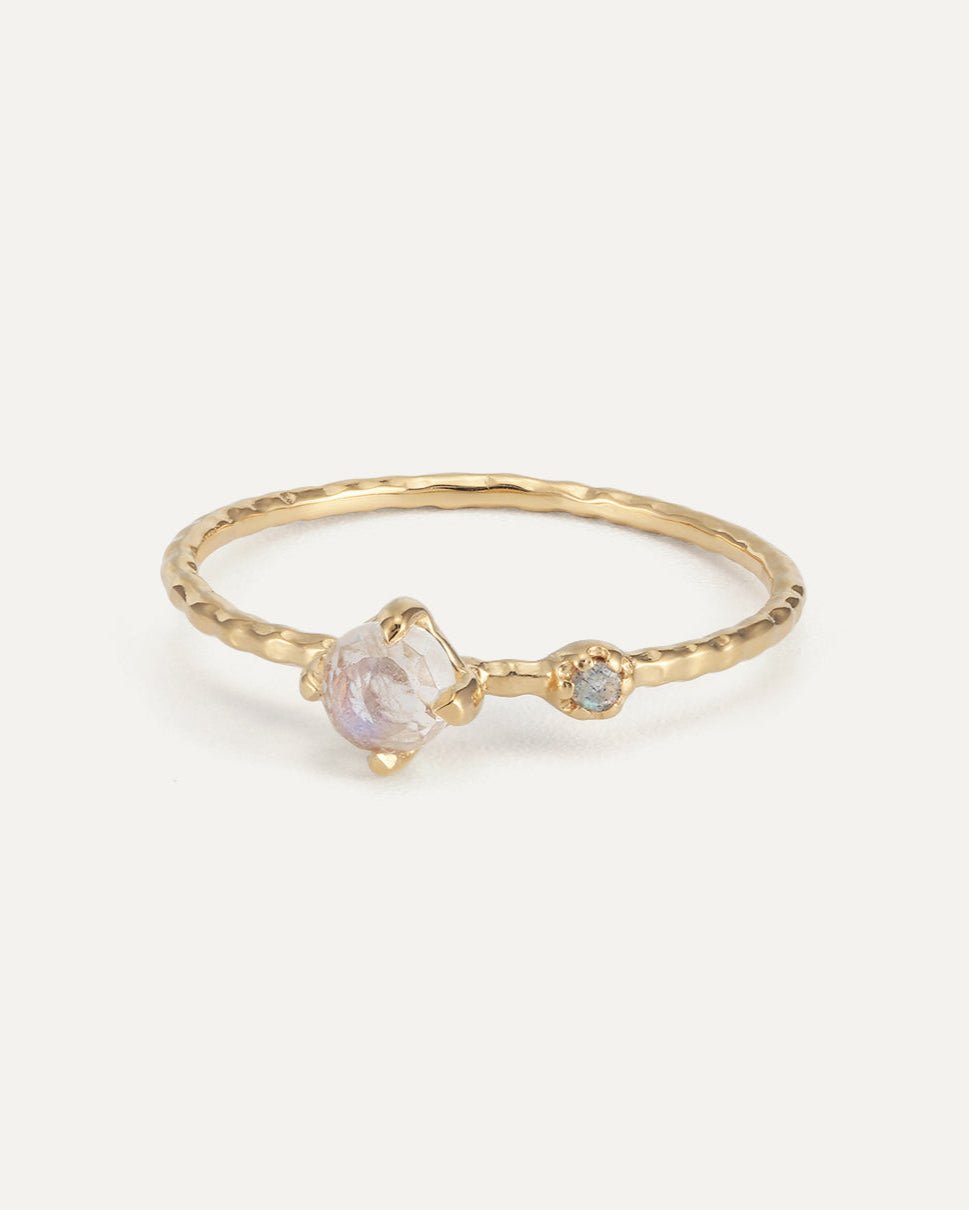 Design: A captivating combination of a larger moonstone with its soft glow and a smaller labradorite, creating a beautiful contrast of hues. The slender ring band enhances this delicate duality, resulting in a ring that feels both ethereal and unique.