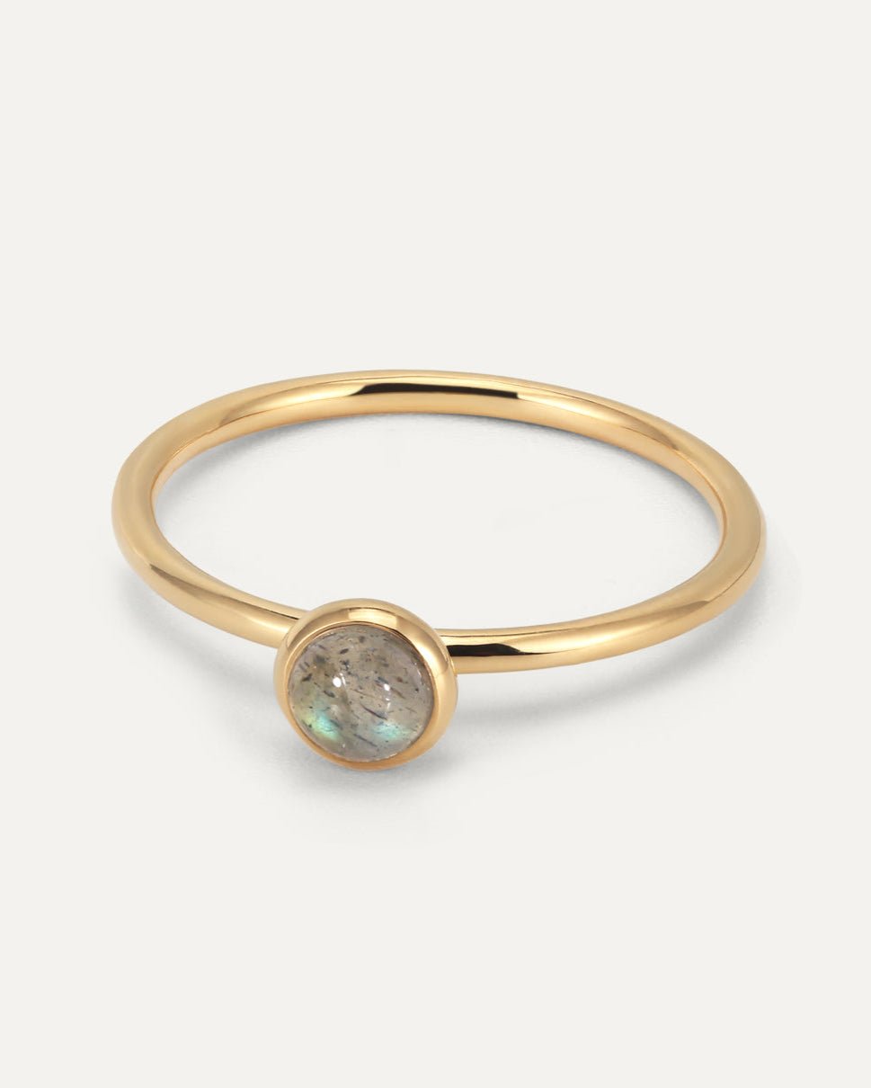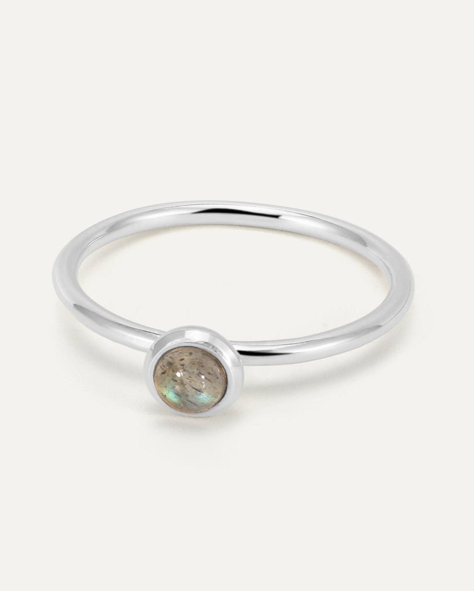 Design: A perfectly round, smooth labradorite stone rests on a seamless, rounded band, like a drop of water on your hand. Its multicolored shimmer evokes the enchanting hues of a mermaid’s skin, adding a subtle, natural allure.