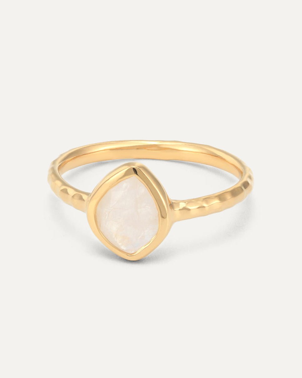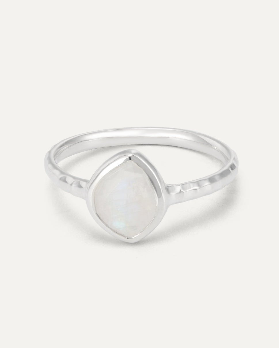 Design: Like a radiant pebble glistening on the ocean floor, this ring showcases an irregularly shaped moonstone with a soft, rainbow-like shimmer. The geometric cut and gently structured band give it an ethereal elegance that feels both timeless and organic.