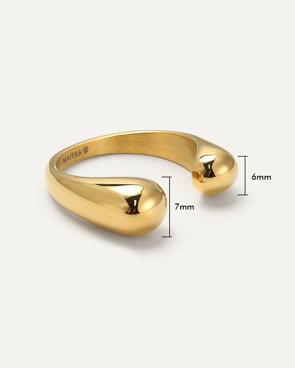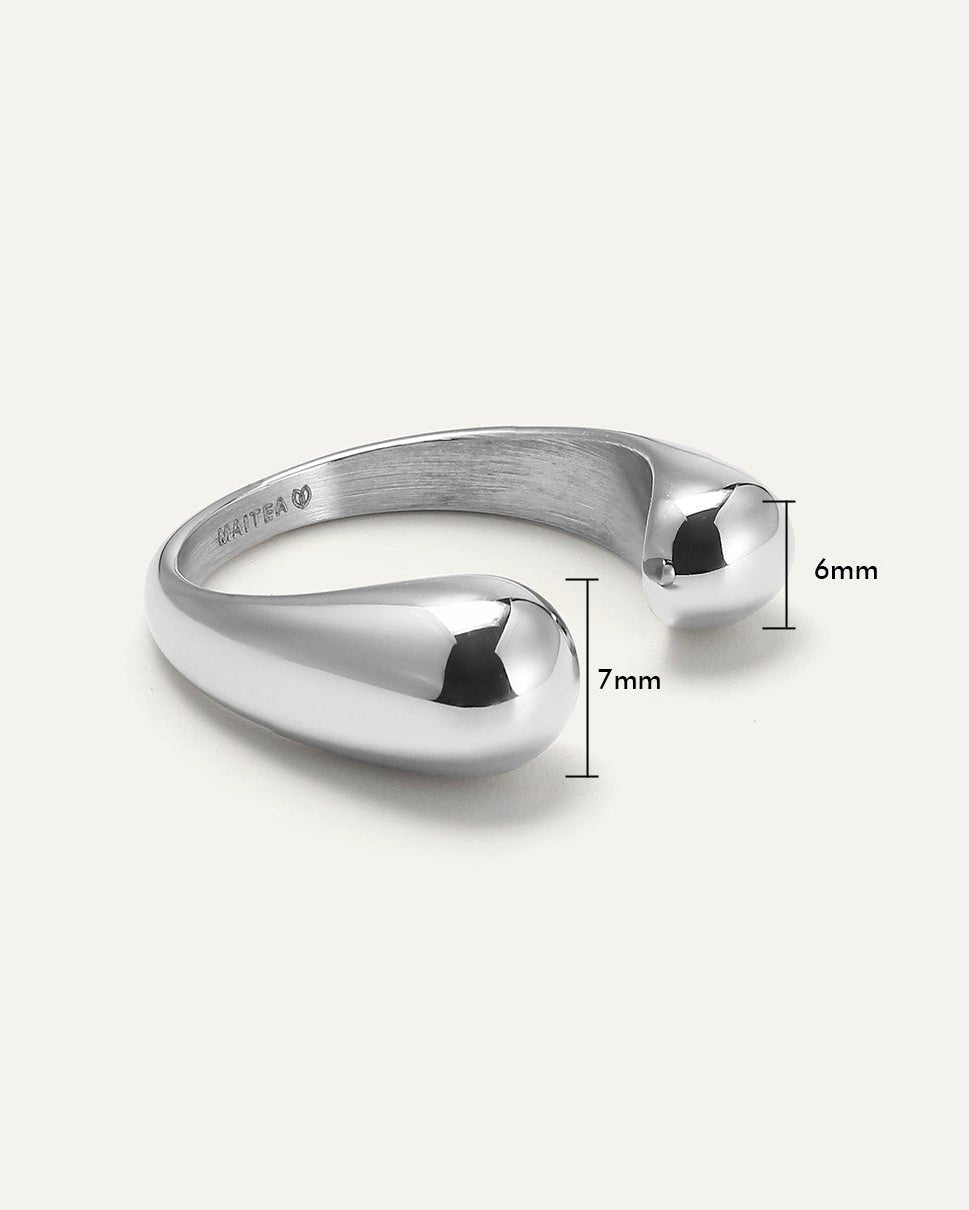 The Floating Bulb Ring brings contemporary style with a unique open-top design, featuring bulb-like accents on each end that add a bold touch. Crafted with high polish on the inside, this ring ensures a smooth, comfortable feel against your skin. Made from durable 316L stainless steel with an optional 18k gold finish, it’s both waterproof and hypoallergenic. Adjustable to fit sizes 52 through 57, this ring is as comfortable as it is stylish, perfect for any occasion.