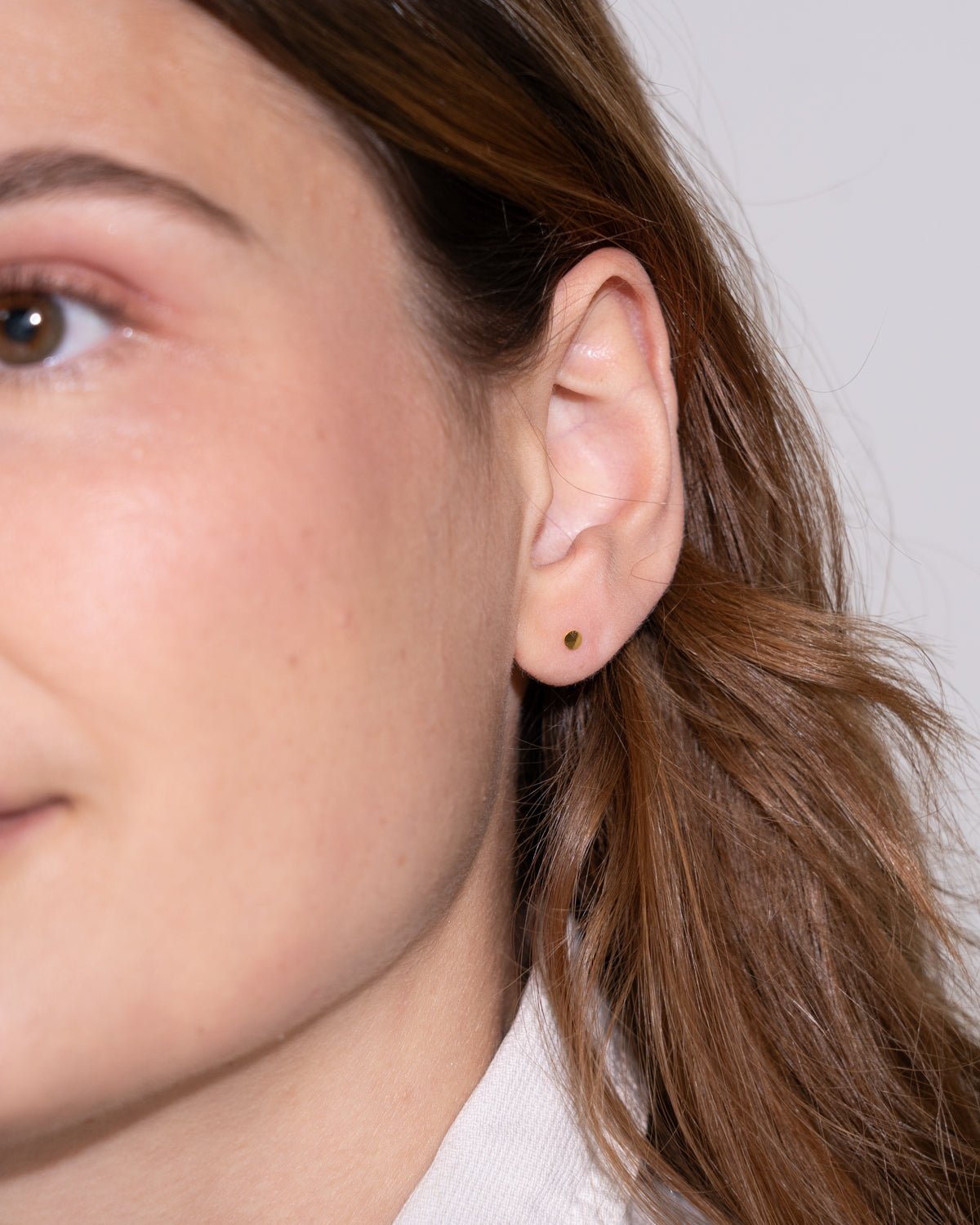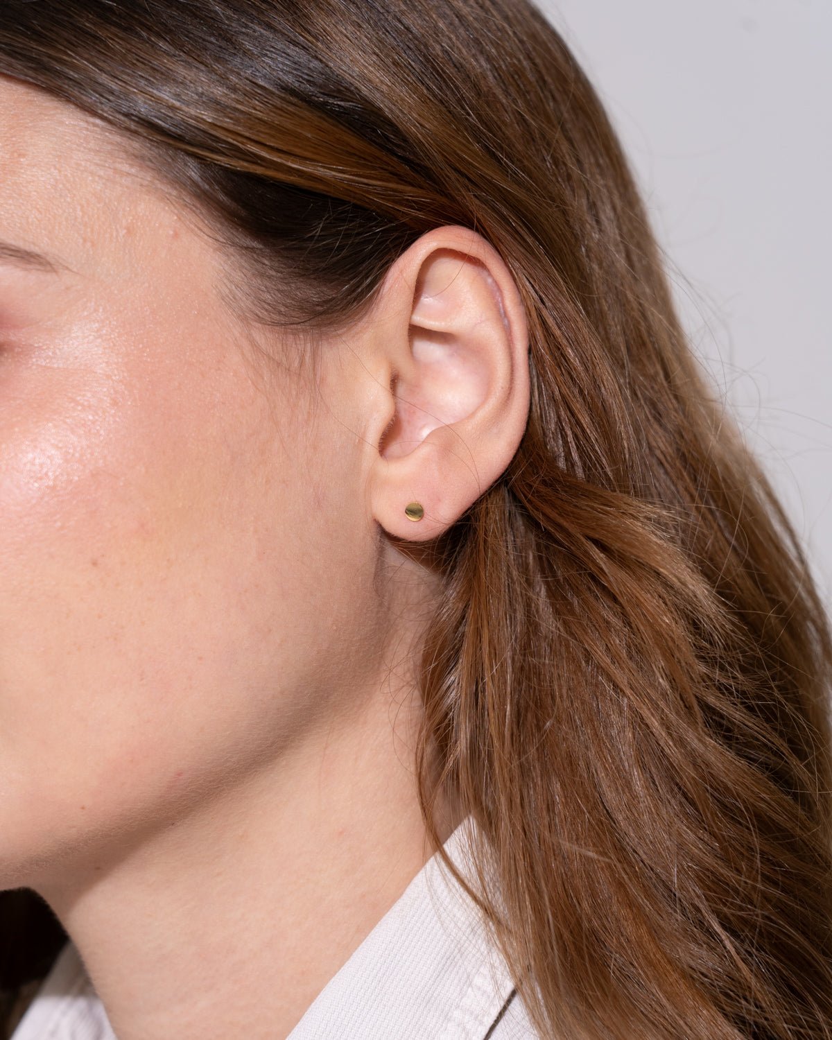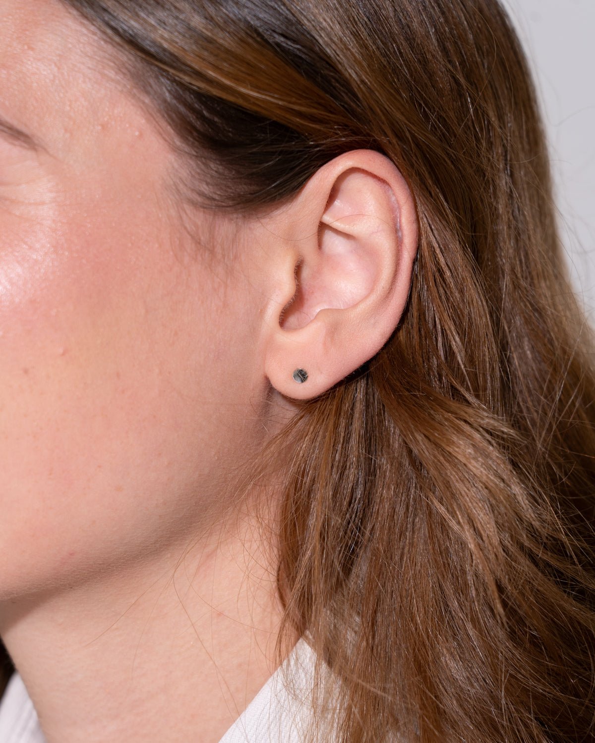 A tiny dot — clean, sharp, and precisely cut, like a sliver of metal sliced from a flat sheet. The look is geometric and bold, but all edges are polished and slightly rounded, so they feel smooth against the skin — no scratching, no digging in. The contrast between the laser-cut style and the soft finish gives this piece its quiet charm.