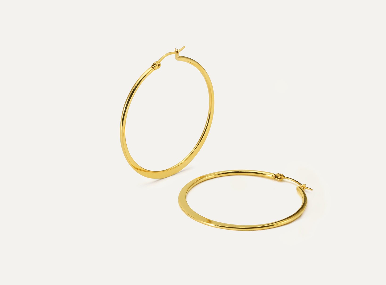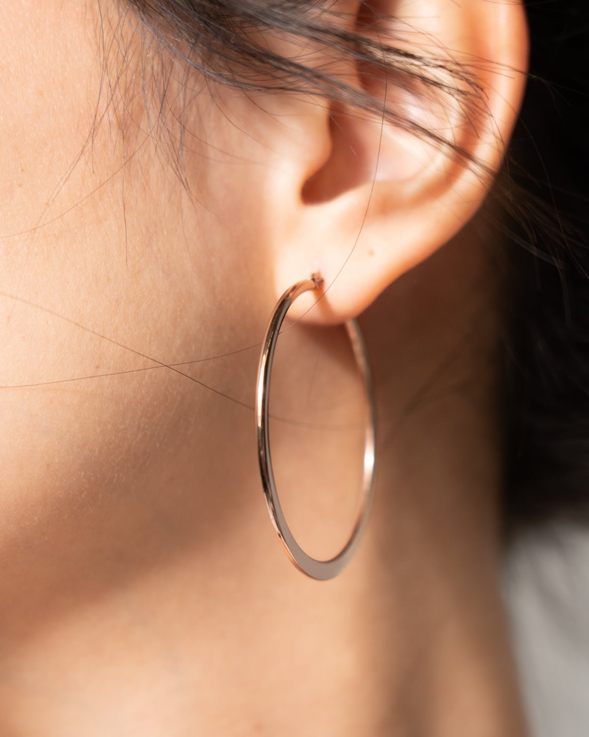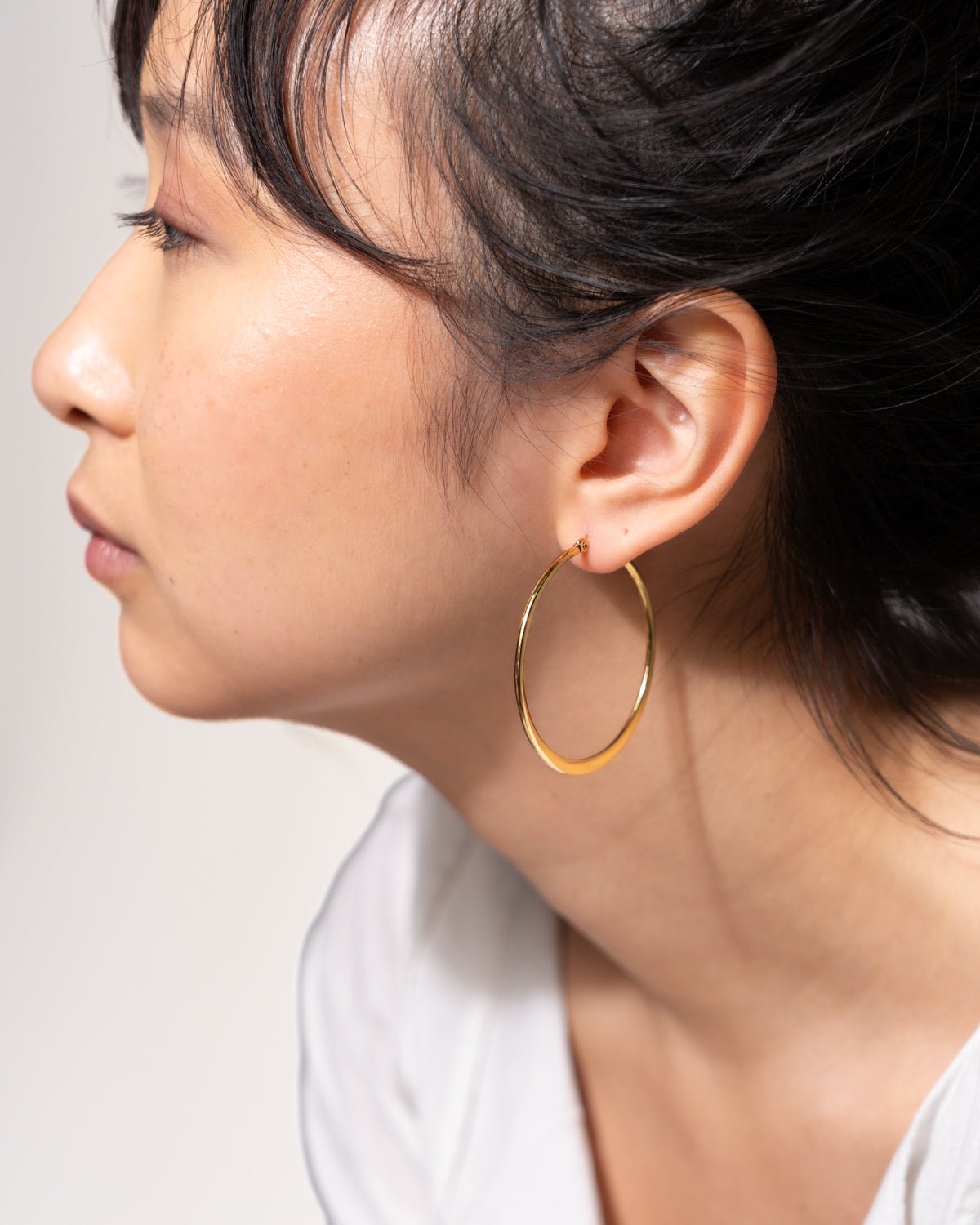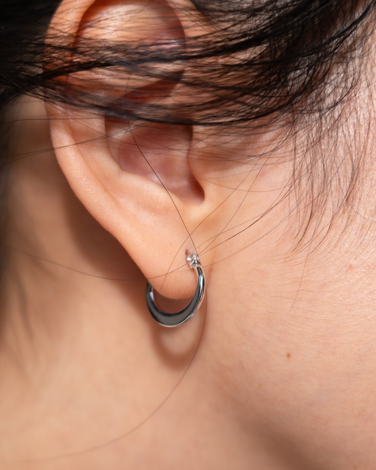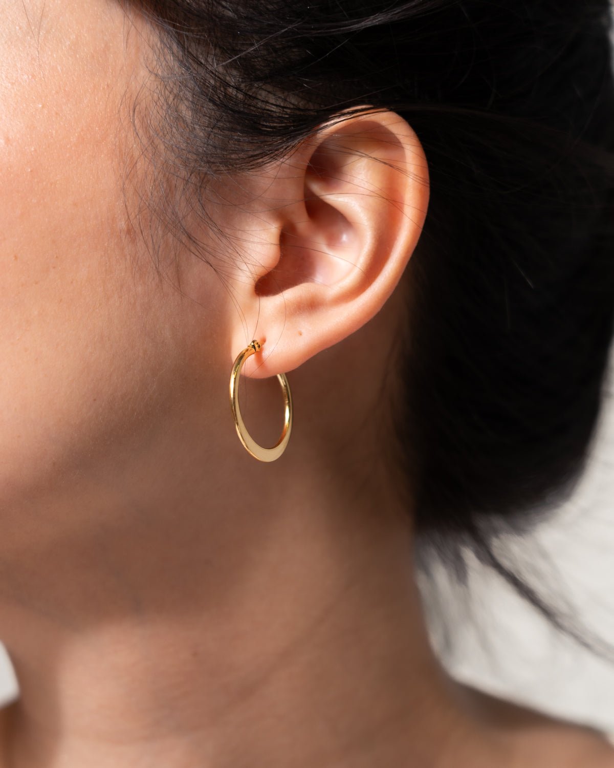 This classic hoop embodies timeless elegance cherished for generations. Its vertically flattened design gives it a finer and more subtle look compared to our Flat Plane Hoop. The flattened section resembles a delicate crescent moon – perfect for those seeking a classic piece with a touch of uniqueness.