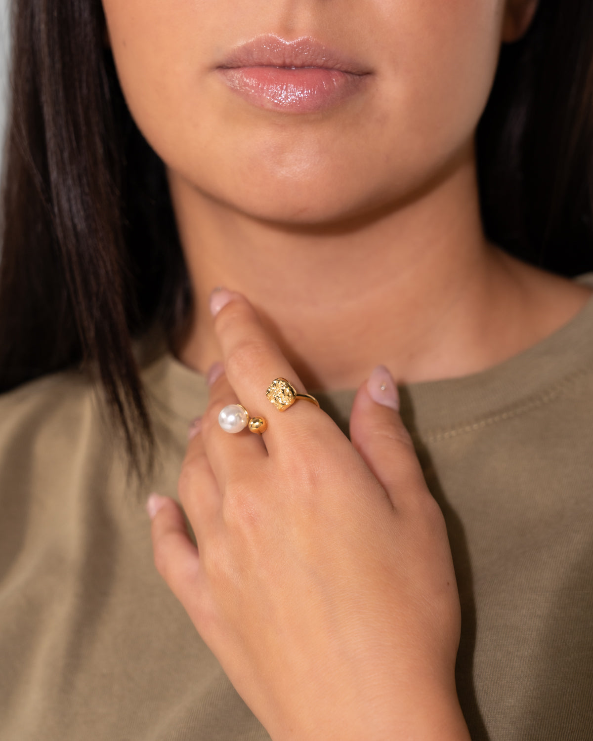 Eine Koralle, eine goldene Perle und eine Süßwasser-Perle formen einen Ring, der wie eine seltene Pflanze wirkt. Die poröse Struktur auf einer Seite erscheint so organisch, als sei sie direkt von der Oberfläche einer Koralle geprägt worden. Ein zartes Design, das durch seine natürliche Eleganz besticht.