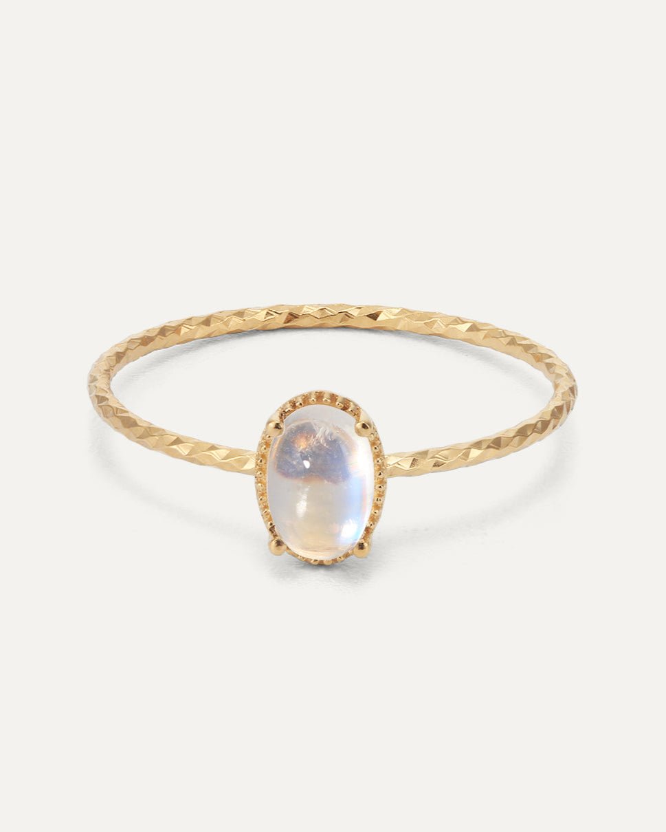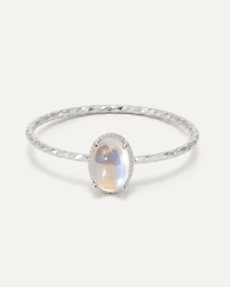 Design: Featuring an oval moonstone with a subtle rainbow shimmer, this ring is held by four prongs on a finely structured, dotted band, available in silver or gold-coated silver. The soft luster of the moonstone and the delicate band combine for a look that's both graceful and majestic.