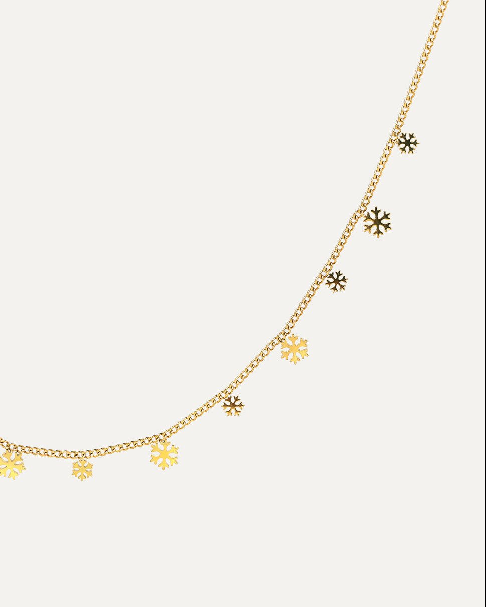 This necklace features delicate snowflake charms that shimmer softly , their intricate design catching the light in a way that feels both personal and magical .